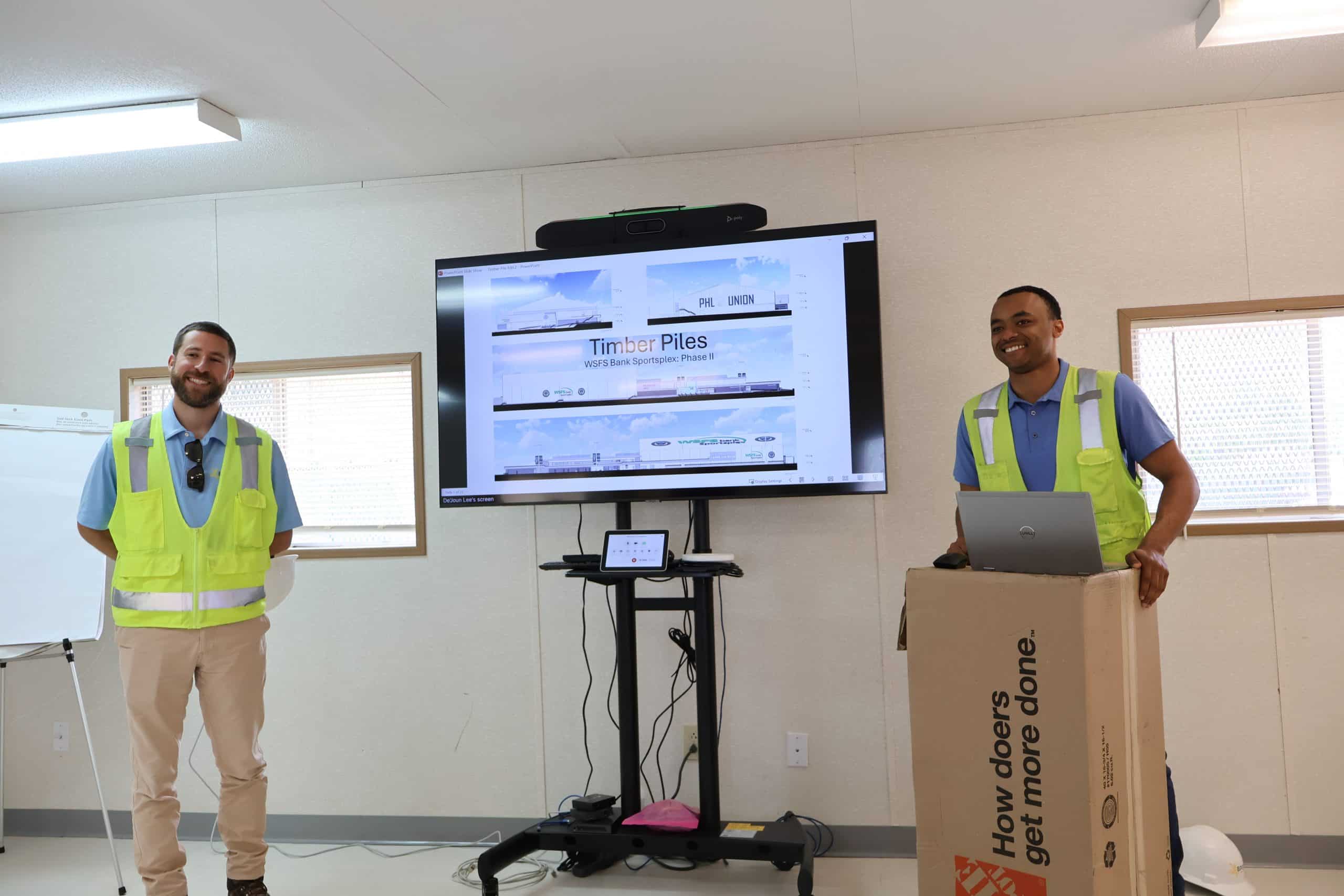 In June, Project Engineer De’Joun Lee and Project Manager Kyle Butler discussed ground improvement techniques being used at WSFS Bank Sportsplex Phase II. The 86,628 SF fieldhouse and roughly 86,000 SF of Support Buildings/Flex Space for programming are being constructed using timber piles to increase the bearing capacity of structural fill, directly support the structural slab and steel structure footings. Due to the brownfield nature of the site and a large compressible layer (ranges from 12 to 18’ in depth) in the soil profile, ground improvements are necessary to combat settlement issues, increase bearing capacity, reduce permeability, mitigate liquefaction, and decrease footing sizes.