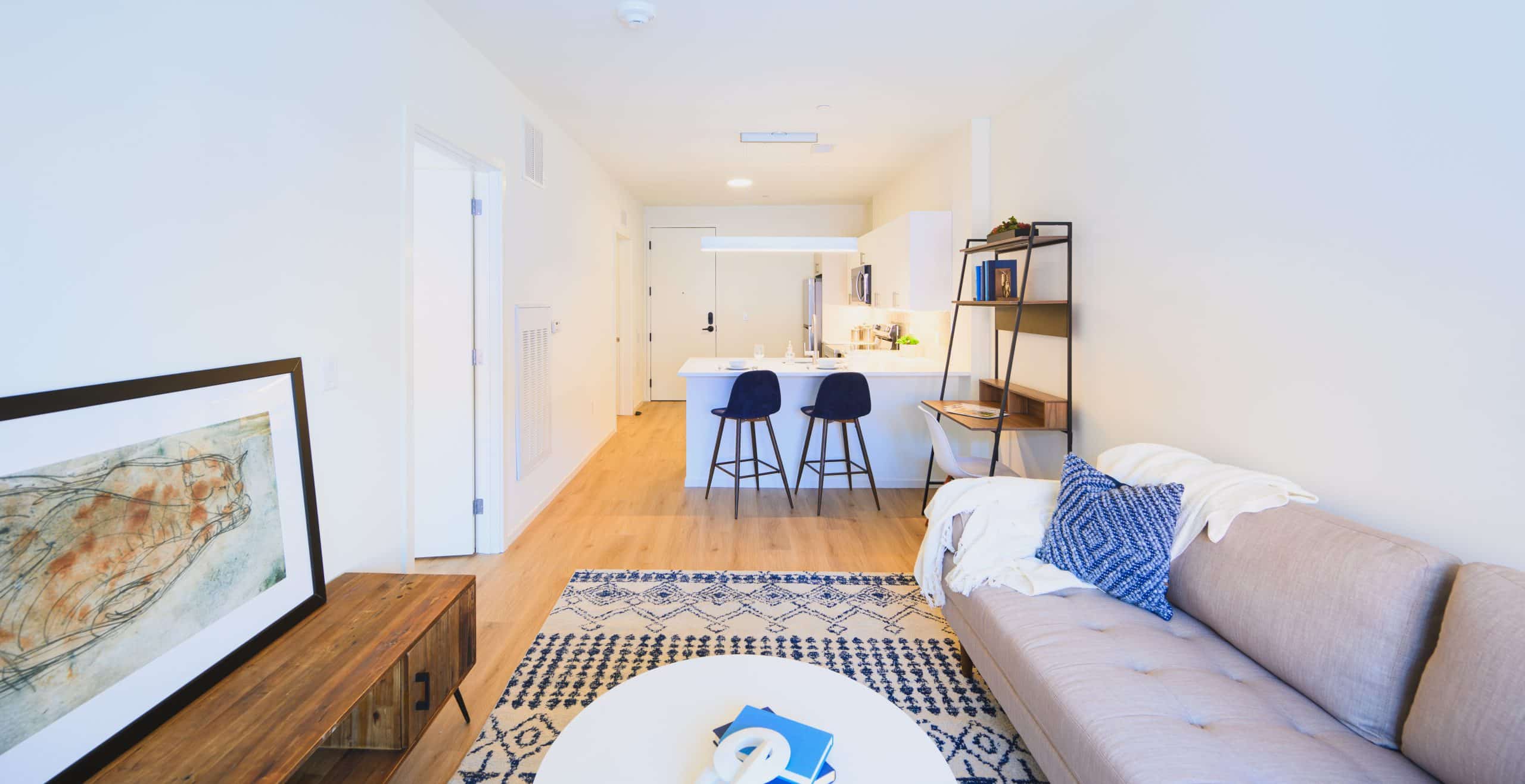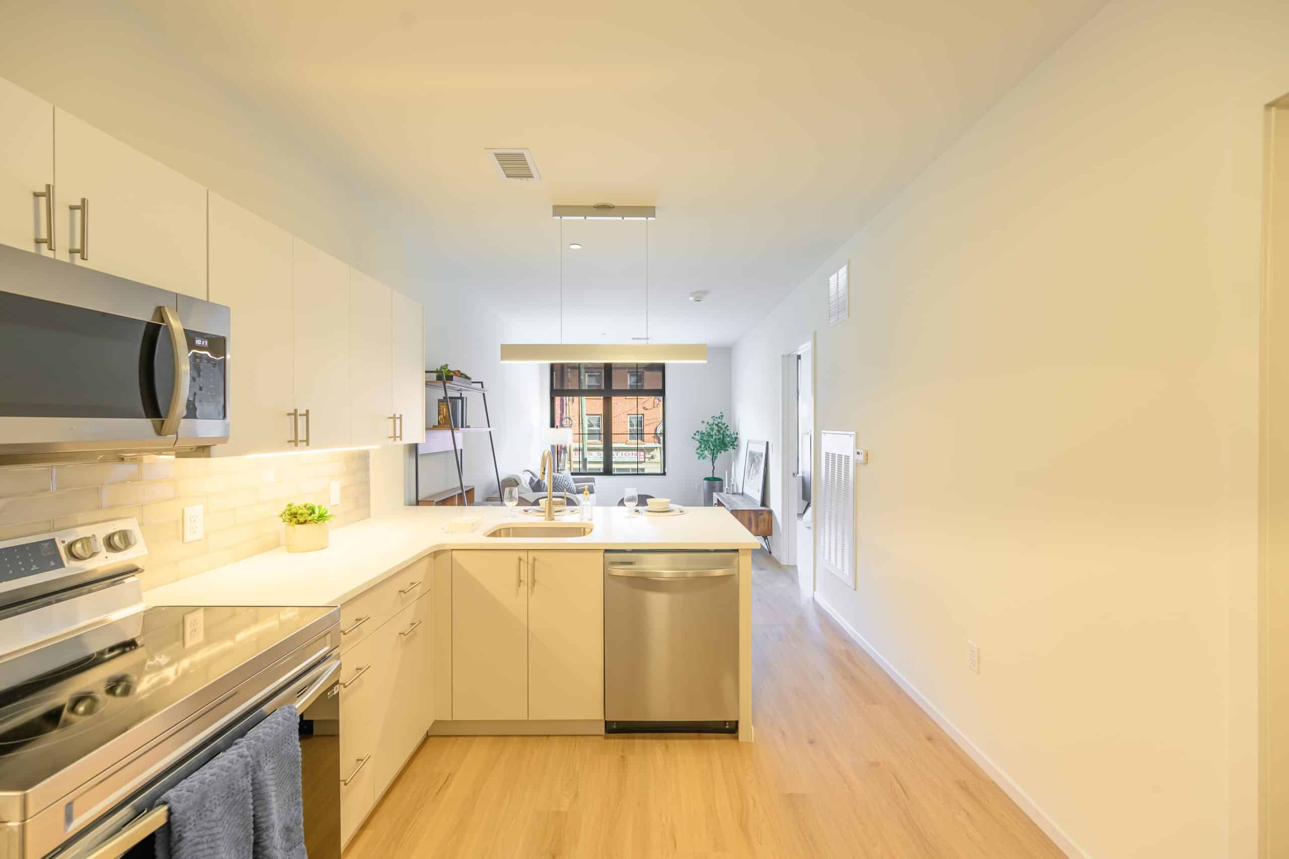 Designed by Digsau, the $16 million development spans three buildings increasing from four to six stories across the site. The building design is sensitive to the historic characteristics in the neighborhood while still being contemporary and attractive for today’s modern renter. One and two-bedroom apartments feature high-end finishes and modern conveniences like quartz countertops, LVT flooring, stainless steel appliances, and in-unit washer and dryer. Interior units overlook a lightwell in the center of the building providing ample natural light for residents. Onsite amenities include a fitness center, resident lounge, and private rooftop deck.