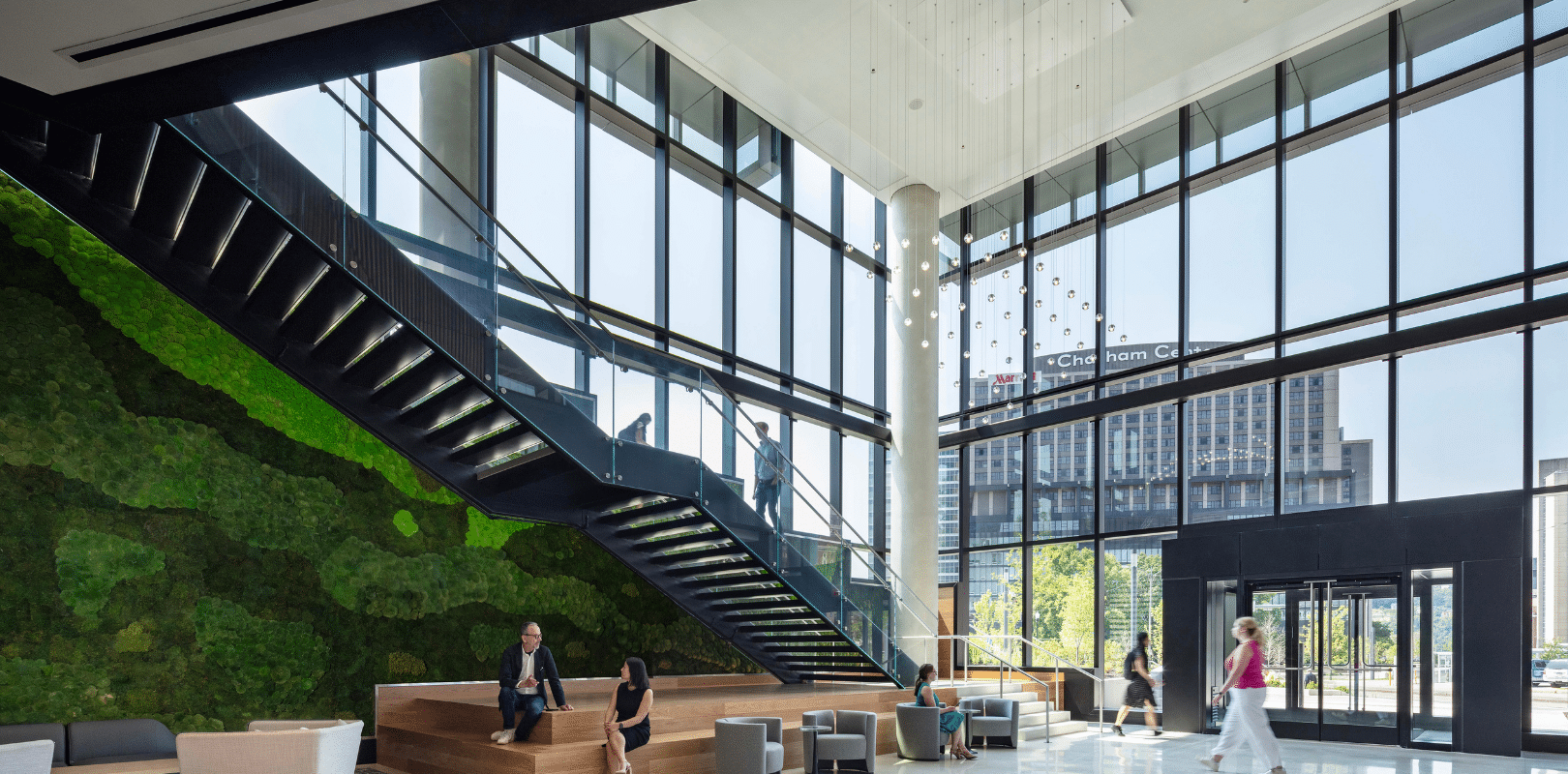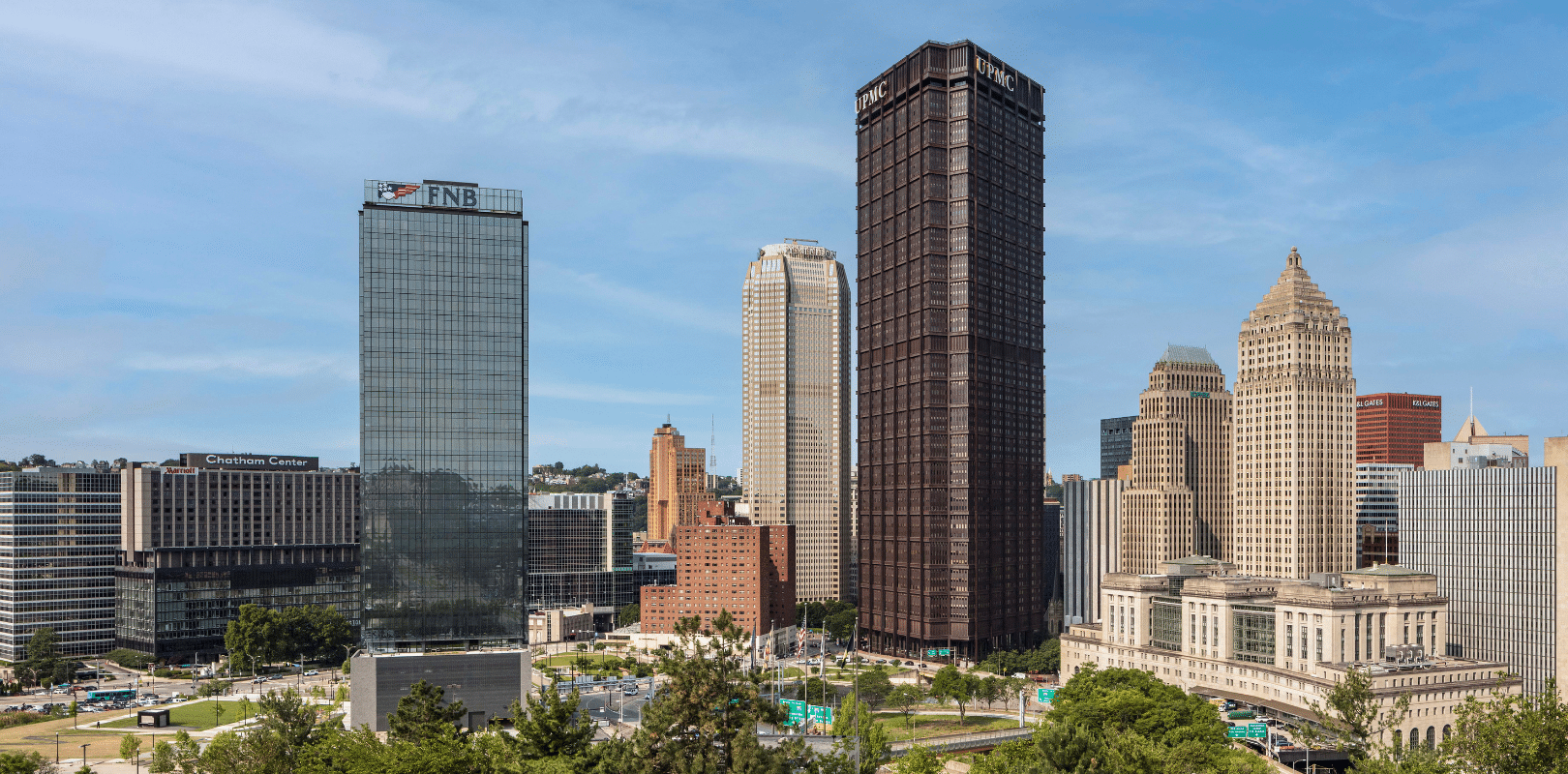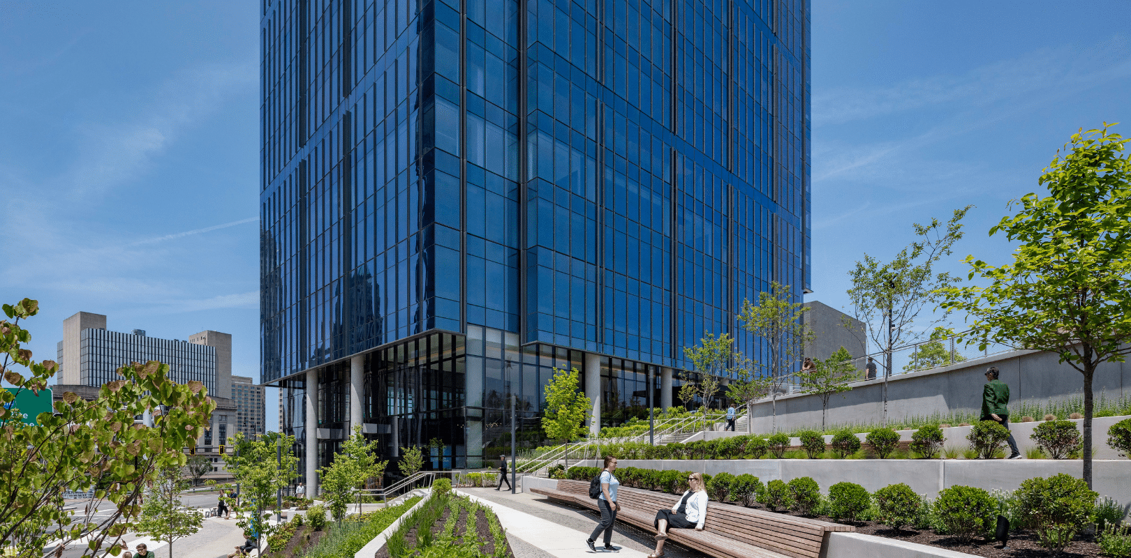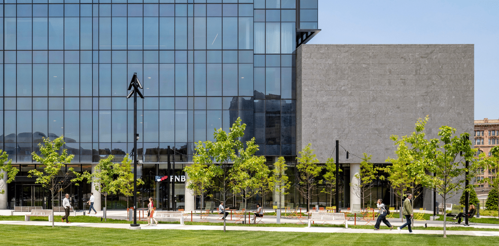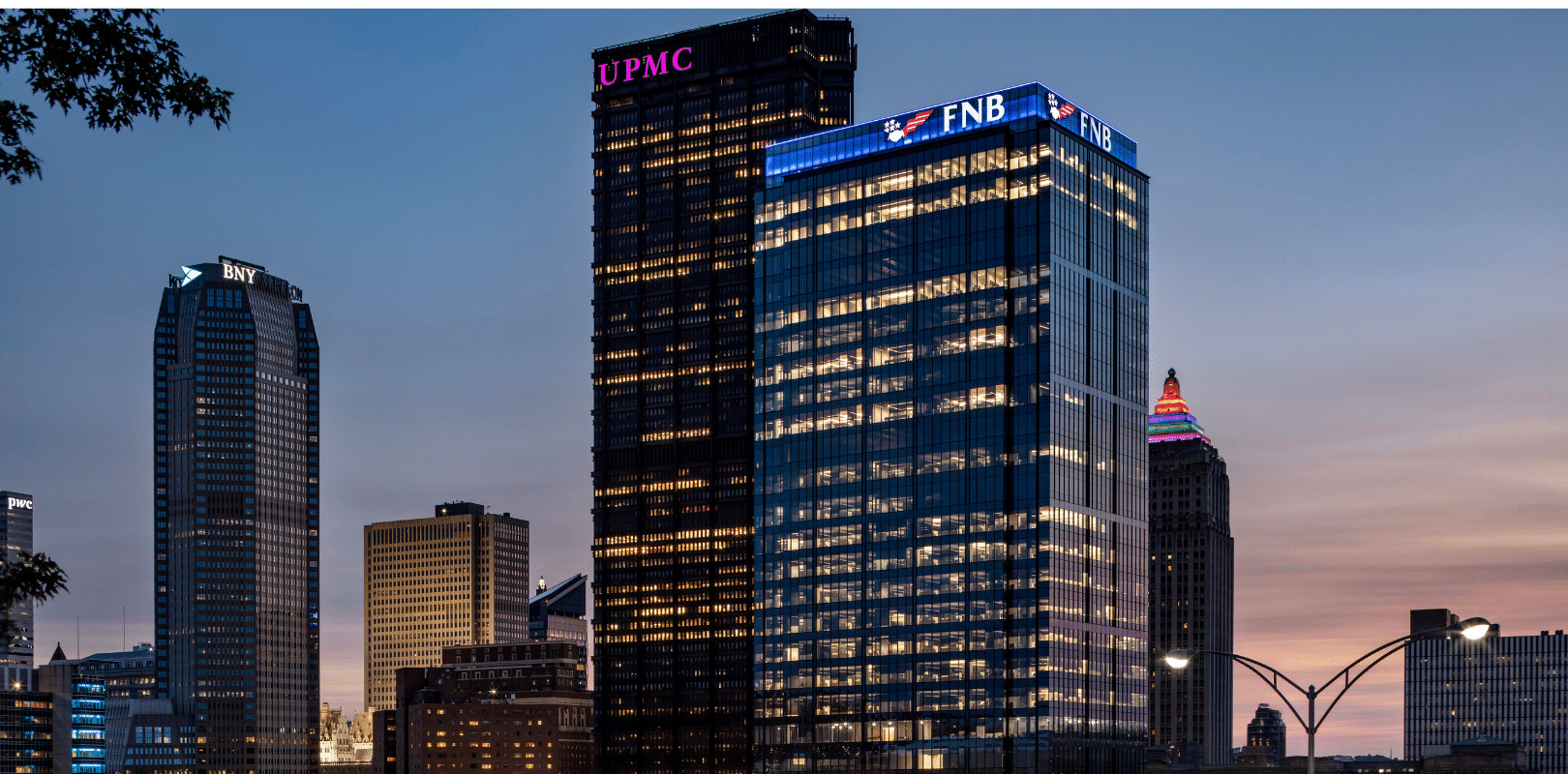 Designed by Gensler, FNB Financial Center is a 26-story, Class A office tower that redefines Pittsburgh’s Central Business District. Rising over 400 feet, this landmark development is the first commercial building on the former site of the Pittsburgh Civic Arena and the first multi-tenant office tower in downtown Pittsburgh in four decades. FNB Financial Center is LEED Gold certified, anchoring Pennsylvania’s first LEED Gold for Neighborhood Design district and setting a new standard for sustainable urban development.
