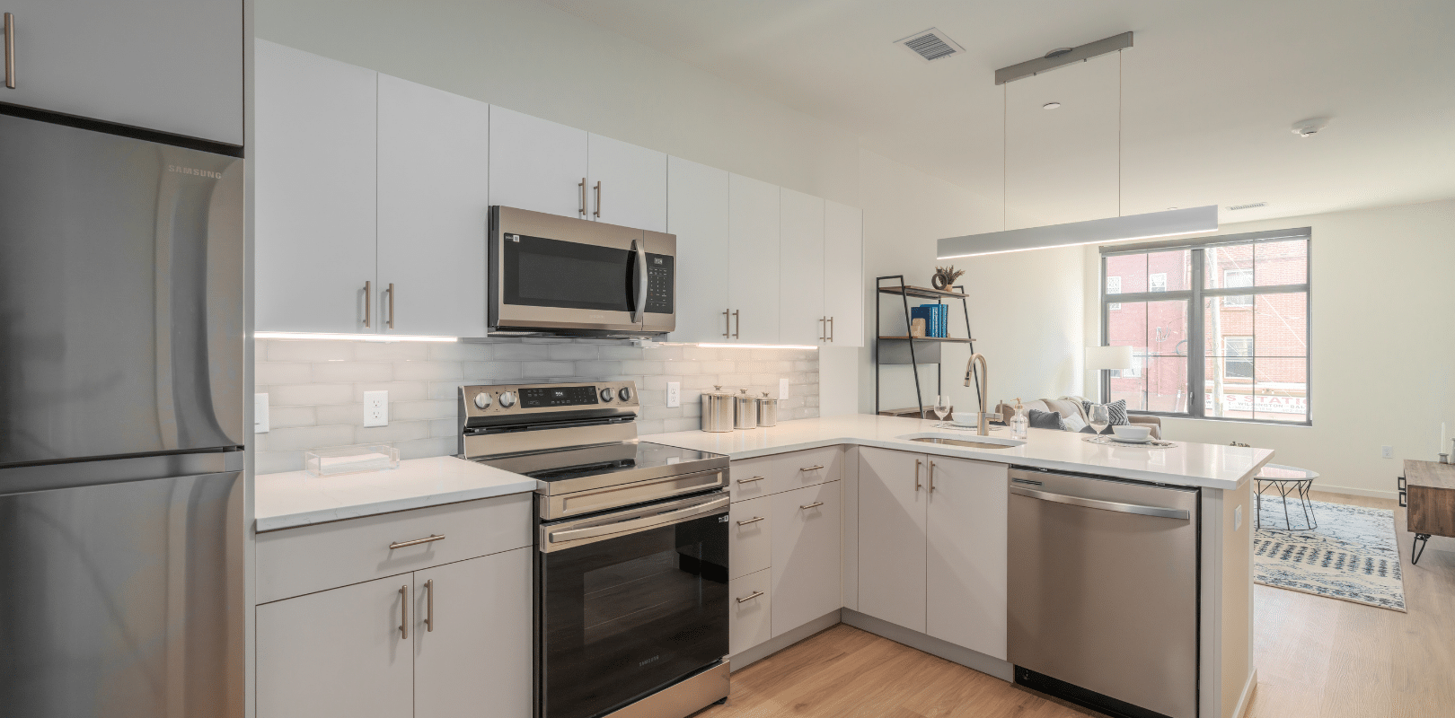 - One and two-bedroom apartments feature high-end finishes and modern conveniences like quartz countertops, LVT flooring, stainless steel appliances, and in-unit washer and dryer.