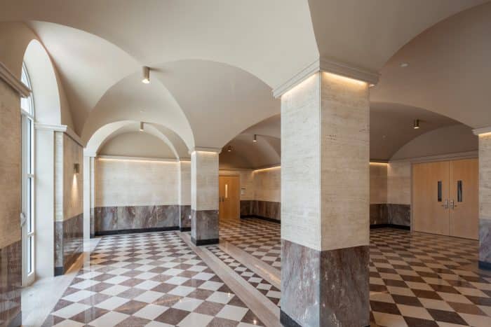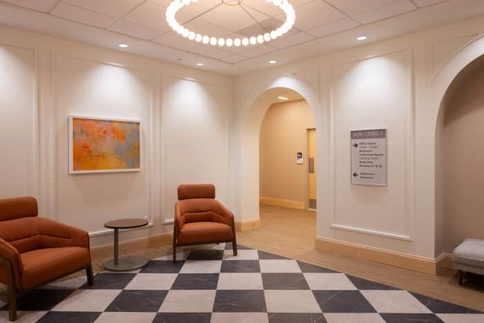 Throughout construction, the team carefully restored several notable architectural elements, including the Auditorium Lobby, copper exterior light fixtures, a mercury-gilded chandelier, and the original patient drop-off canopy.