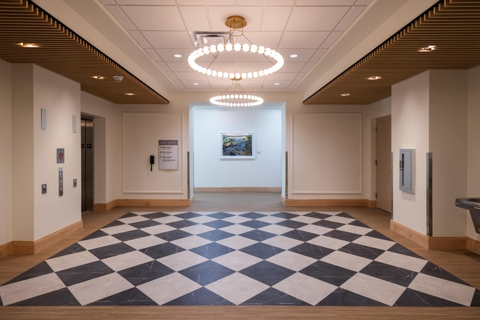 Throughout construction, the team carefully restored several notable architectural elements, including the Auditorium Lobby, copper exterior light fixtures, a mercury-gilded chandelier, and the original patient drop-off canopy.