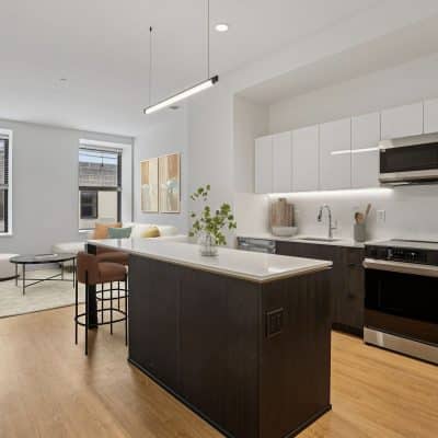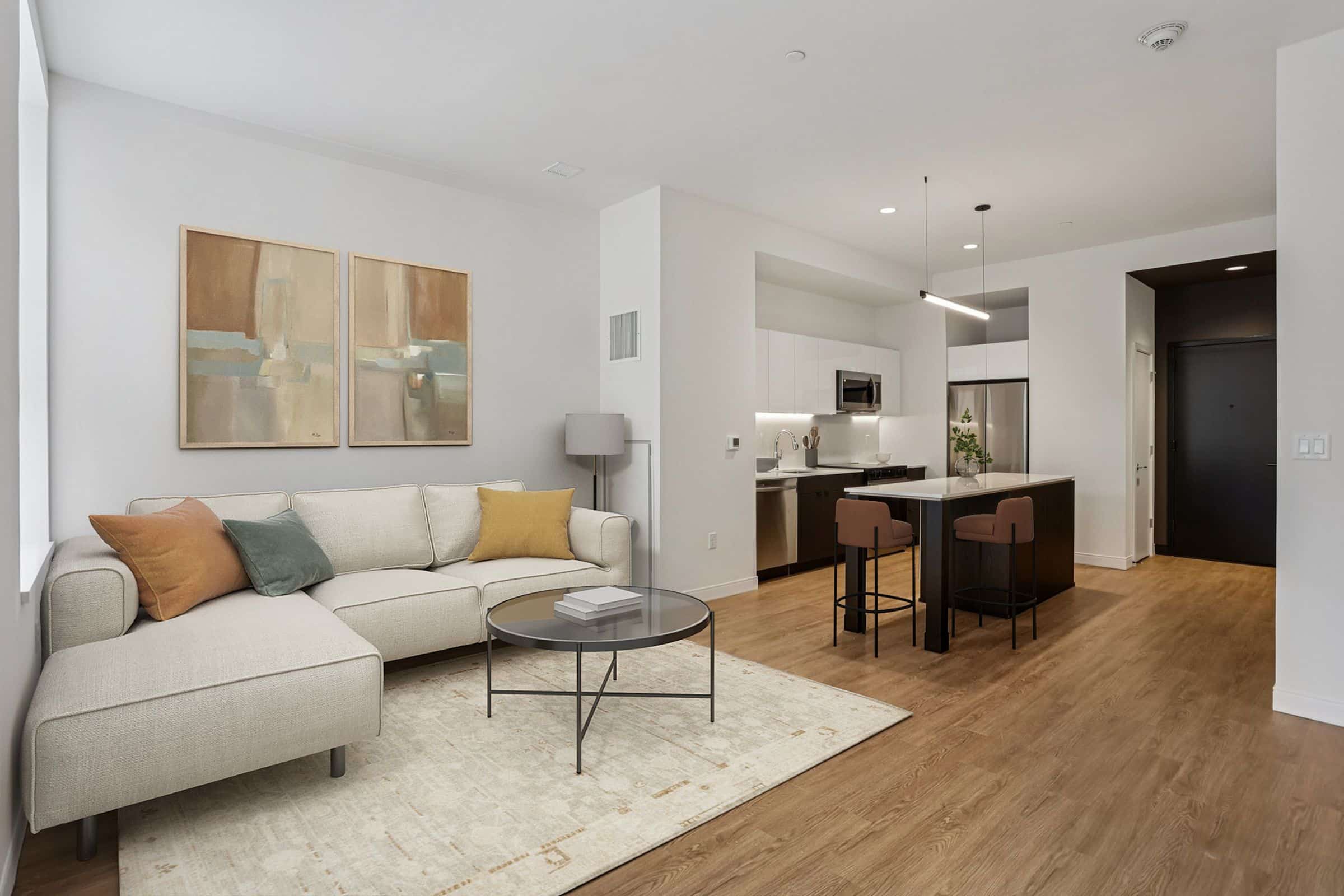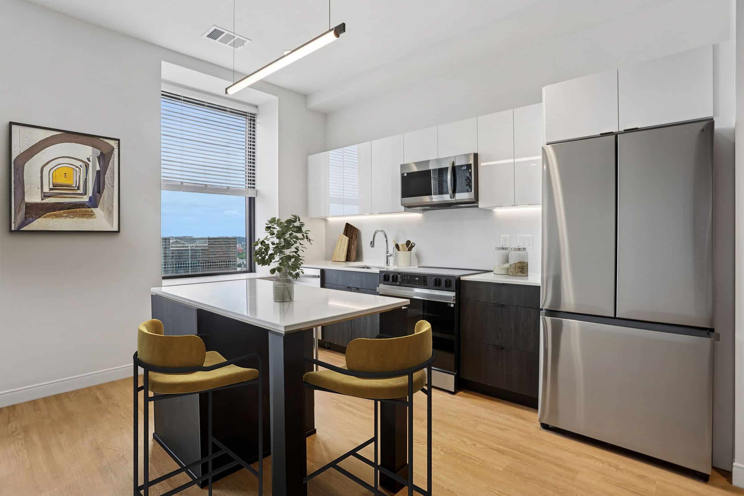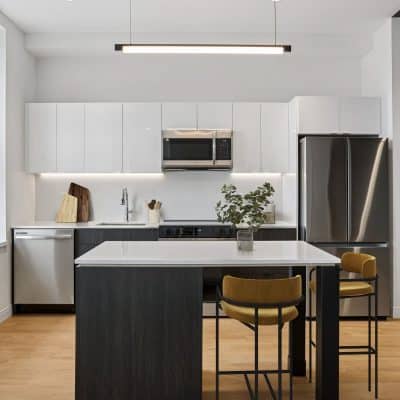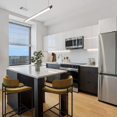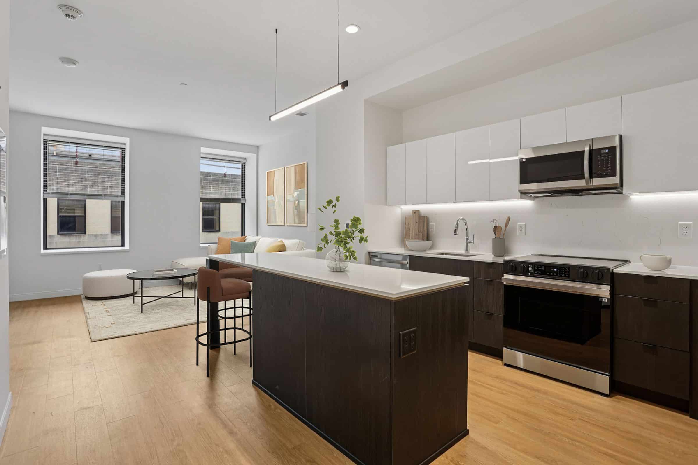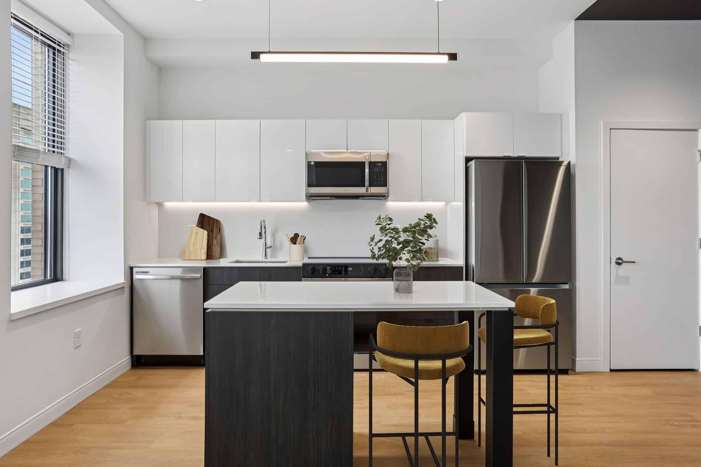 - Studio, one- and two-bedroom apartment homes at The Standard showcase high-end finishes unique to this community like continuous quartz countertops and backsplashes, herringbone tile bathroom flooring, and two-tone upper and lower kitchen cabinets. Other apartment features include large kitchen islands and peninsulas, spacious floor plans, energy efficient stainless-steel appliances, LATCH keyless access smart technology, in-unit washer and dryers, and large operable windows offering a great deal of natural light.